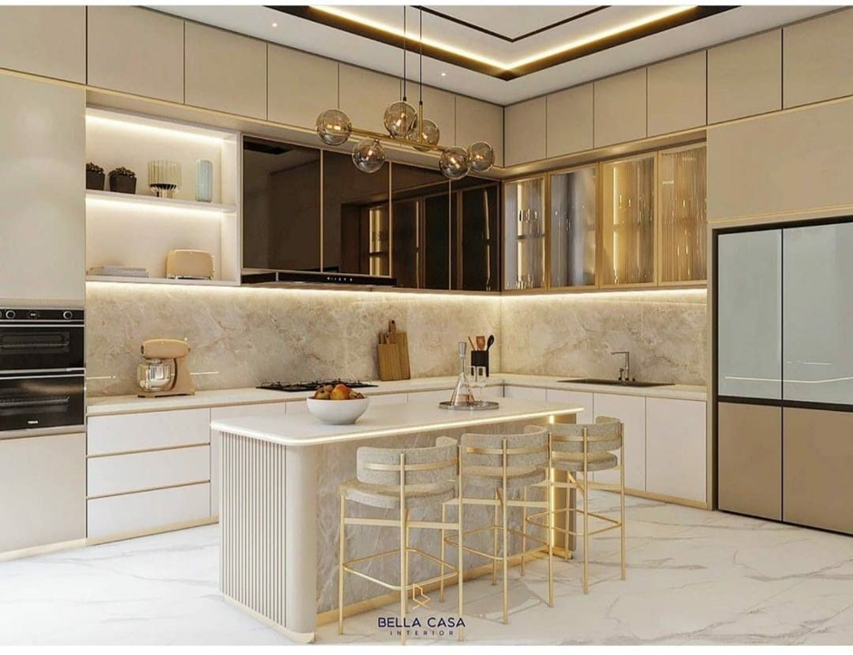 Tambahkan lampu gantung artistik untuk memperkuat nuansa elegan dan mewah di dapur Anda.